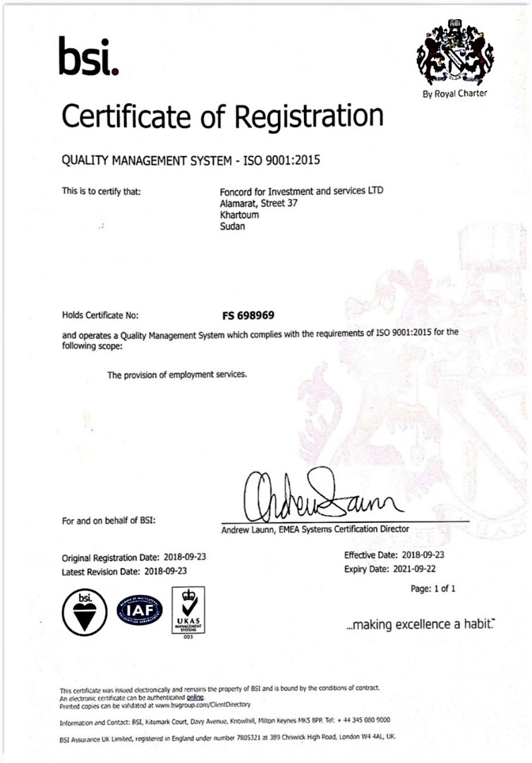 في عام 2018م تمكن المكتب بإيفاء المتطلبات العالمية للحصول علي الشهادة مما جعله المكتب الأول في السودان الحاصل علي شهادة الأيزو.